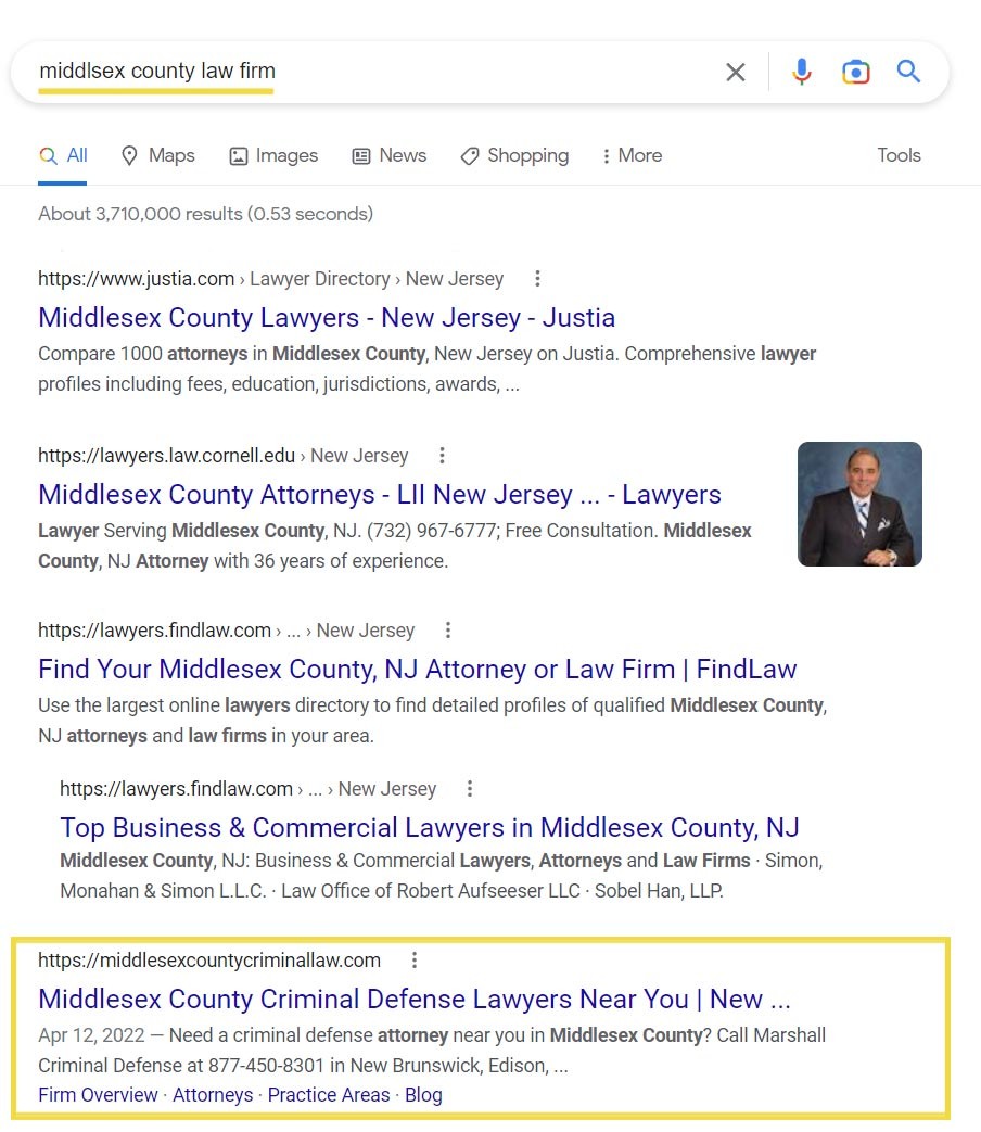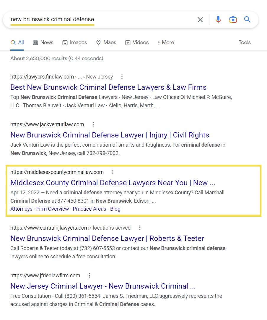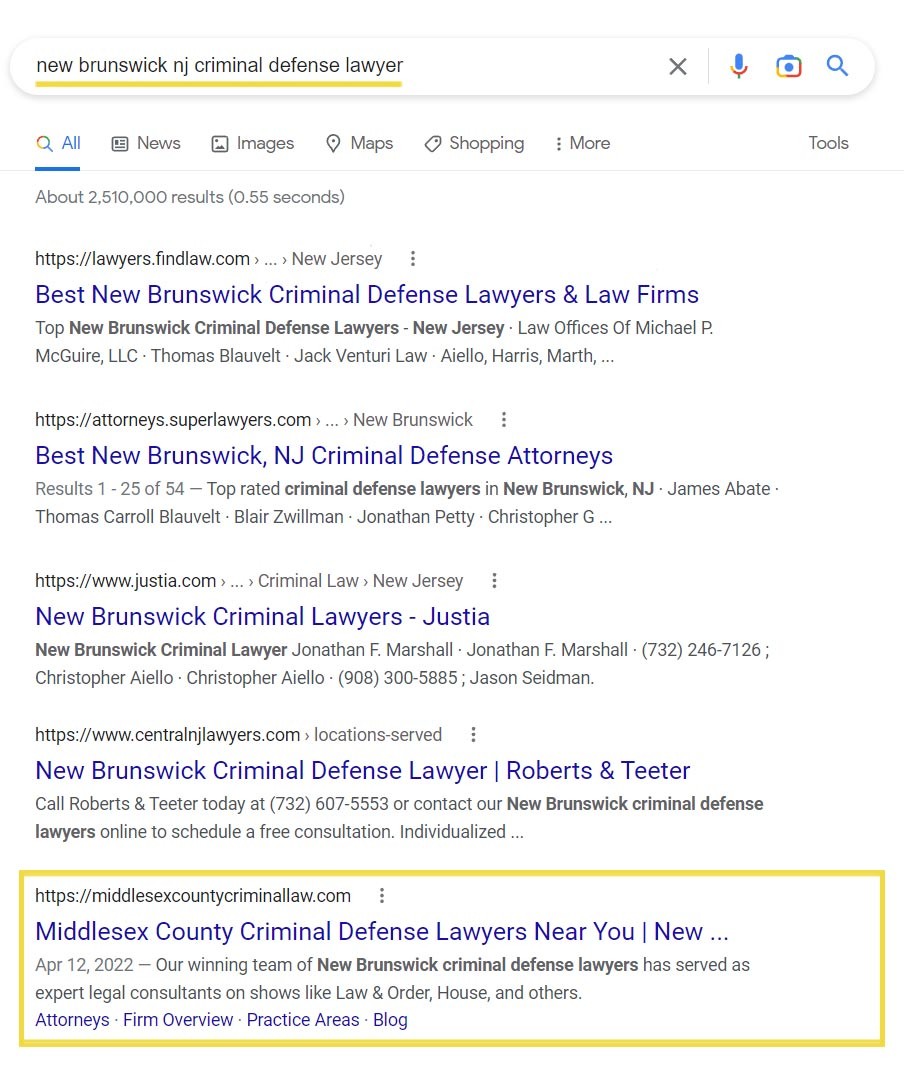 Law firms are a common sight in a highly populated areas like Middlesex County, NJ. The main challenge was competition. We had to make sure that we not only appeared in the search results, but that we also outranked the hundreds of competitors all fighting for attention. When people need fast legal representation, they don’t scroll beyond the first page of search results. The Middlesex County Criminal Law Firm needed to rank at the top of the SERPs to get clicks.