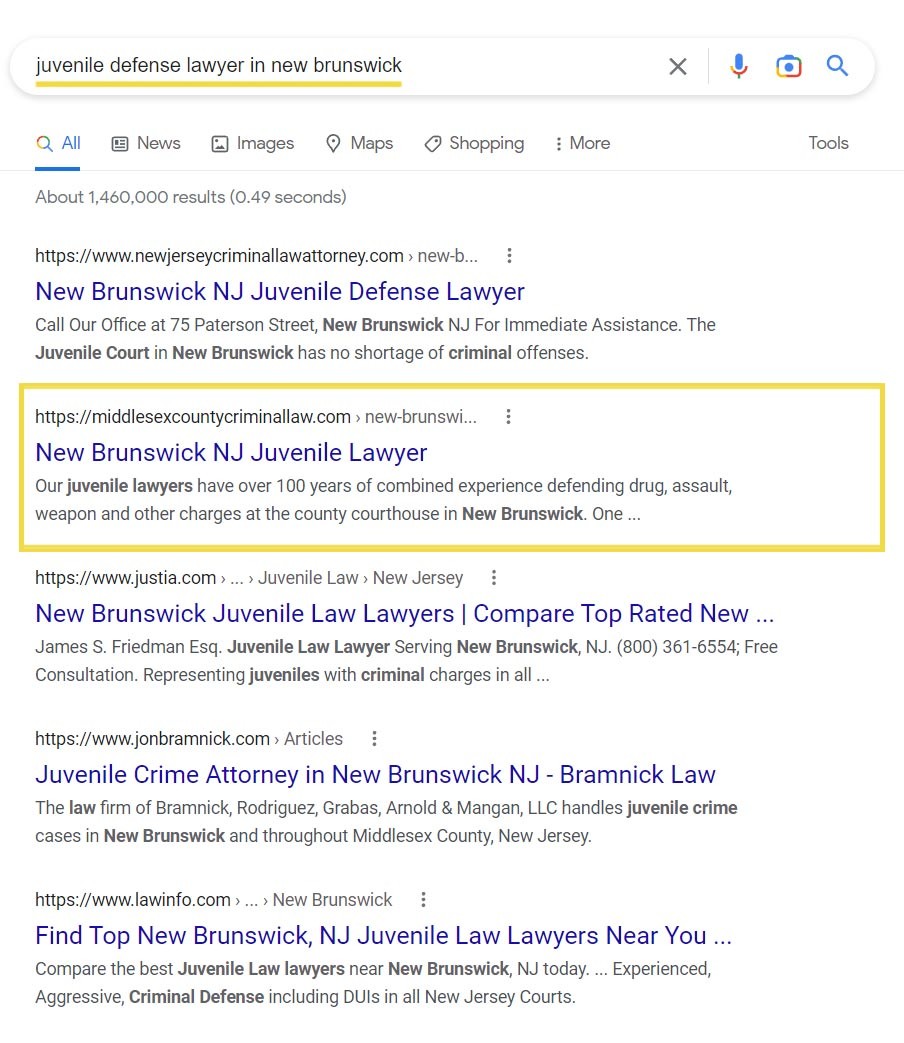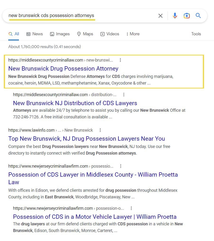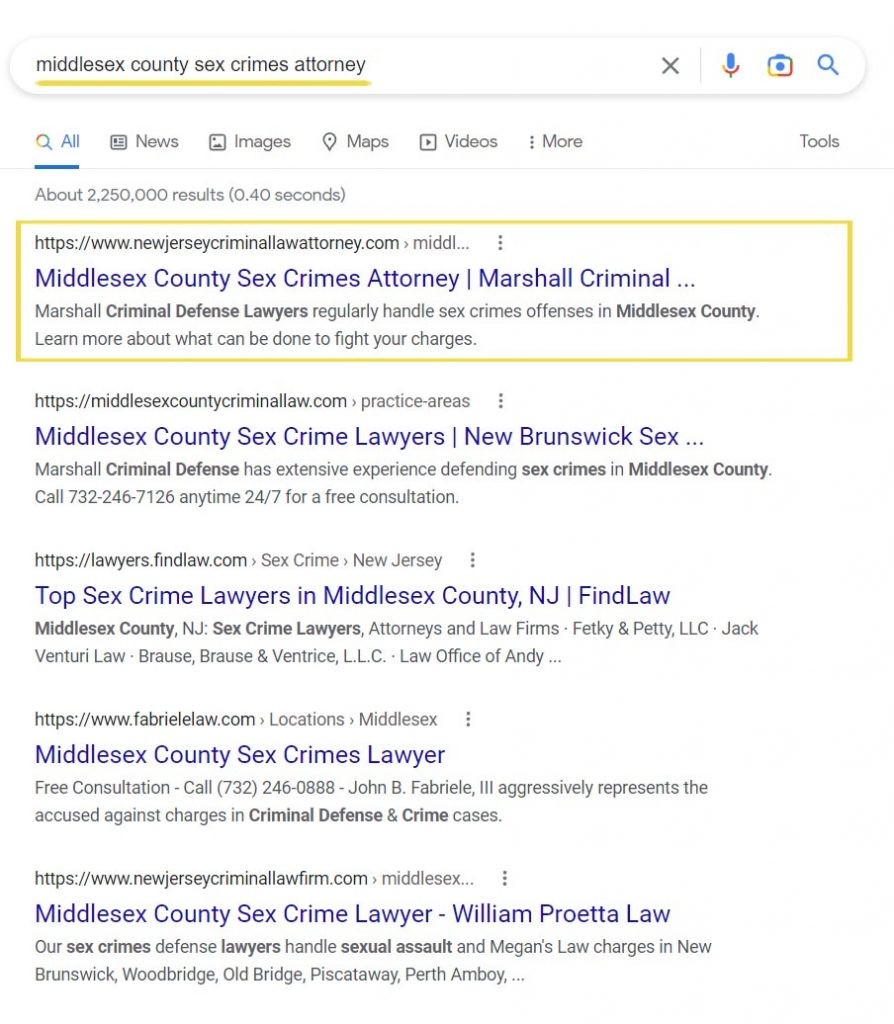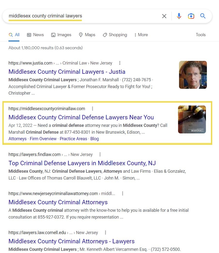 Law firms are a common sight in a highly populated areas like Middlesex County, NJ. The main challenge was competition. We had to make sure that we not only appeared in the search results, but that we also outranked the hundreds of competitors all fighting for attention. When people need fast legal representation, they don’t scroll beyond the first page of search results. The Middlesex County Criminal Law Firm needed to rank at the top of the SERPs to get clicks.