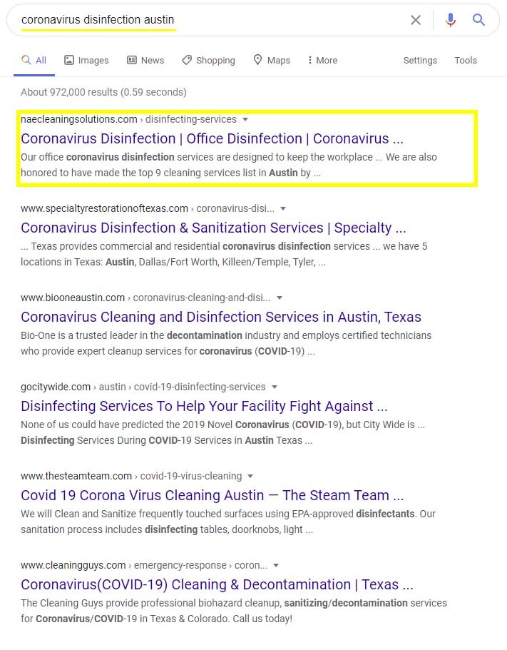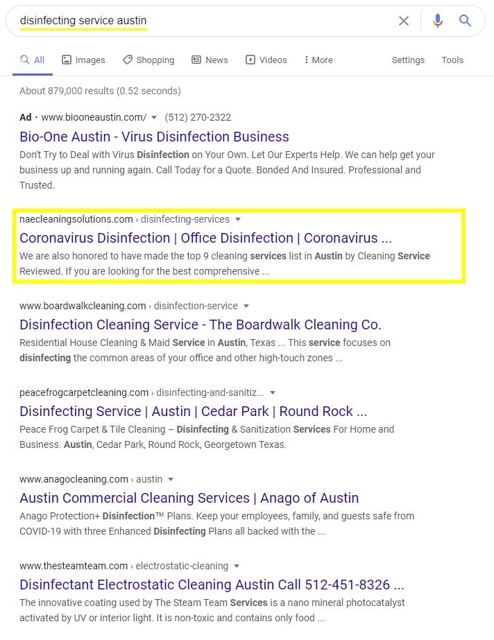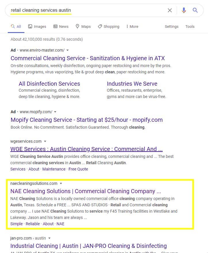 As a commercial cleaning company with an online presence, NAE Cleaning Solutions is not without competition. Most businesses that operate out of an office, studio or retail store rely on online searches to find reliable cleaning solutions. Being at the top of search engine results, then, would be of great benefit to NAE Cleaning Solutions. Our challenge was to achieve this amongst several other service providers in the area.