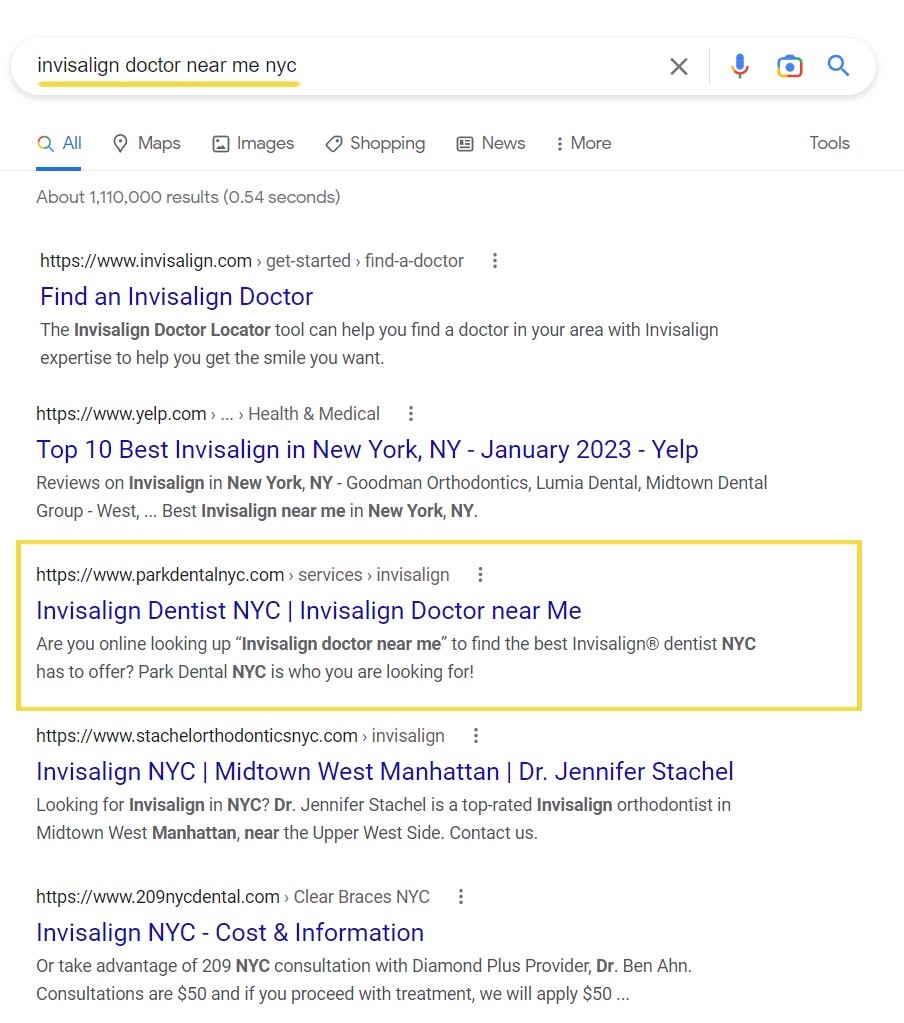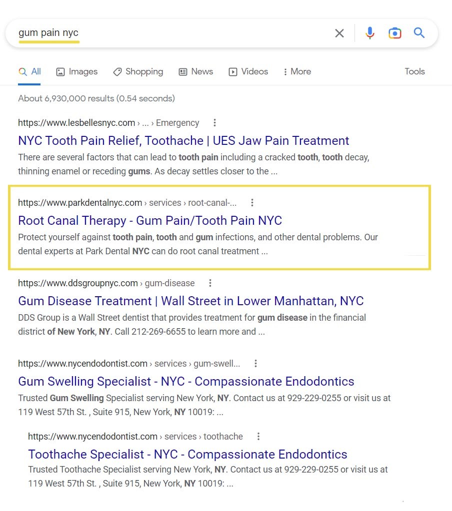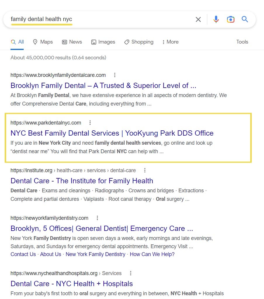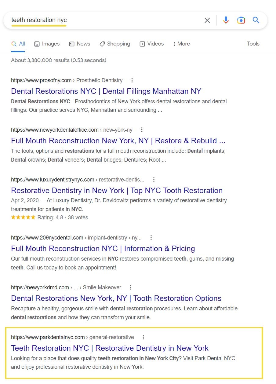 Based in NYC, Dr. Park was facing immense competition online. There are hundreds of thousands of dentists in the area all competing for attention in the search results. Since most people search for dental services online, it was essential to rank at the top of the SERPs for the various services offered at Park Dental to those running the online search in NYC.