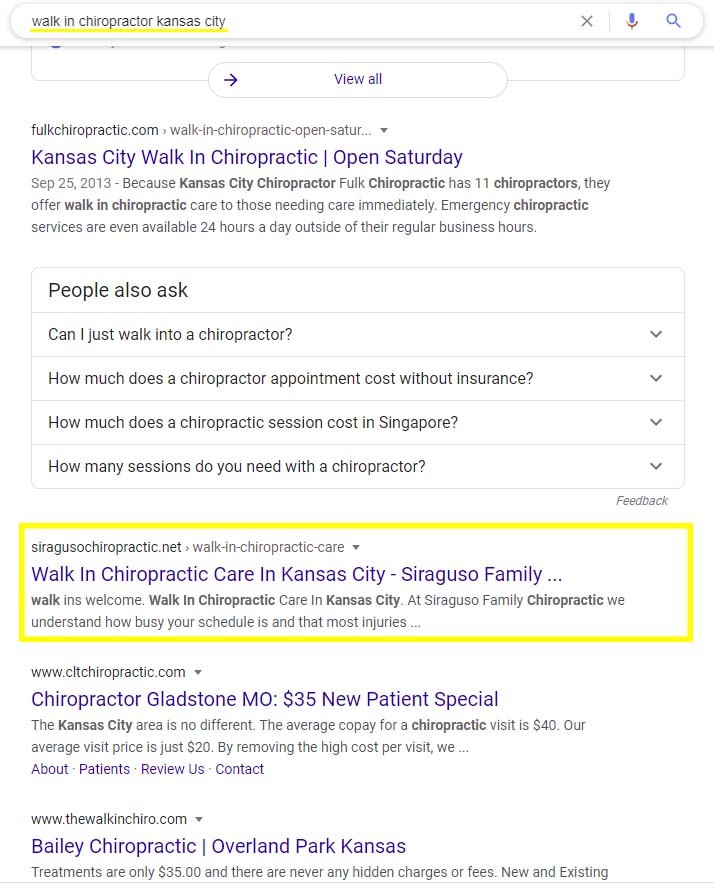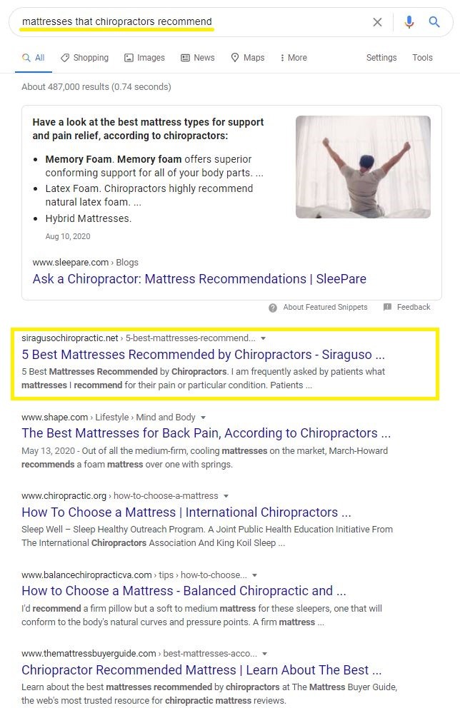 Servicing a very specific area meant that Siraguso Chiropractic needed an SEO strategy that put them at the top of local search results. With several chiropractors practicing across the country, and others within the same area, it was essential that we aim to rank for the Kansas City/Gladstone area, but also for common problems that potential patients were facing, such as mattress solutions for backpain.