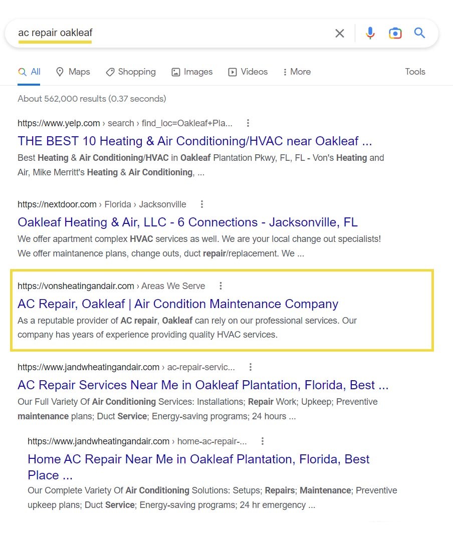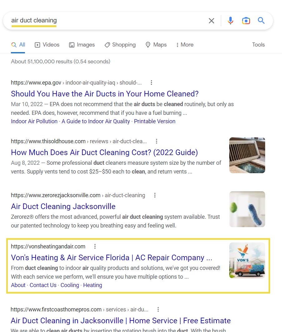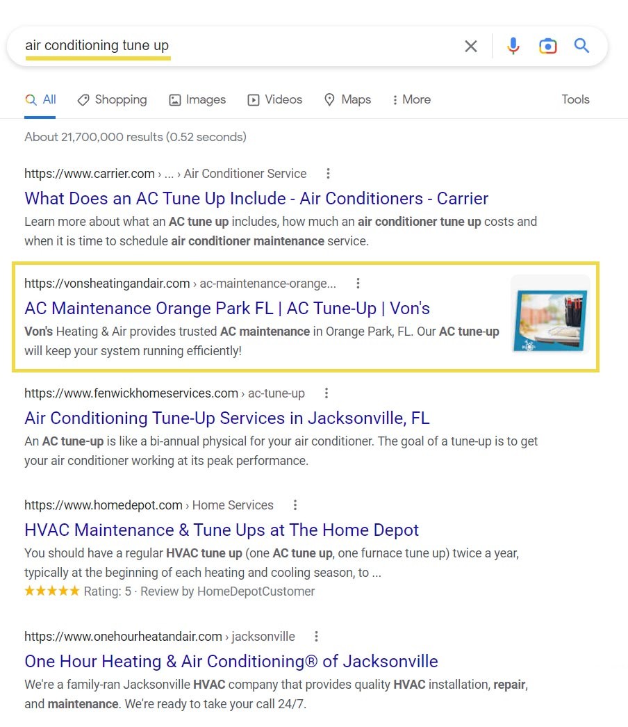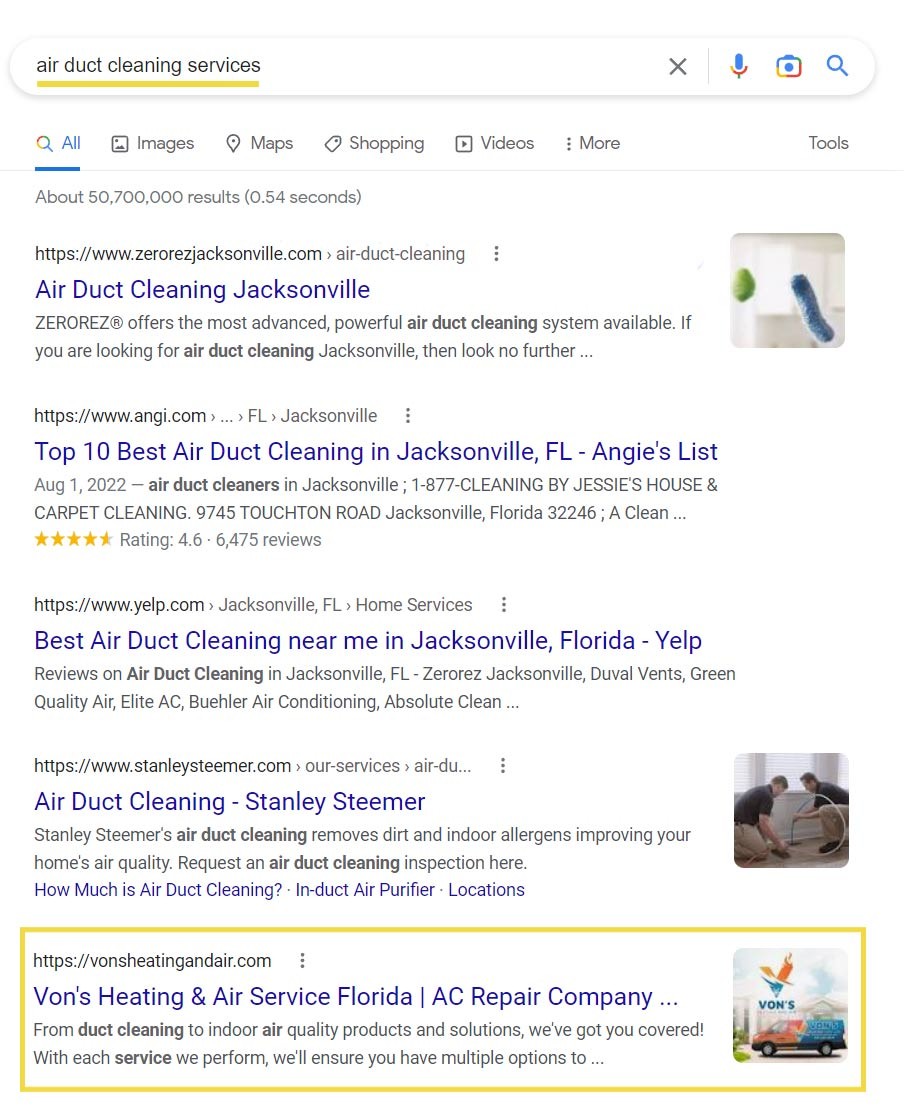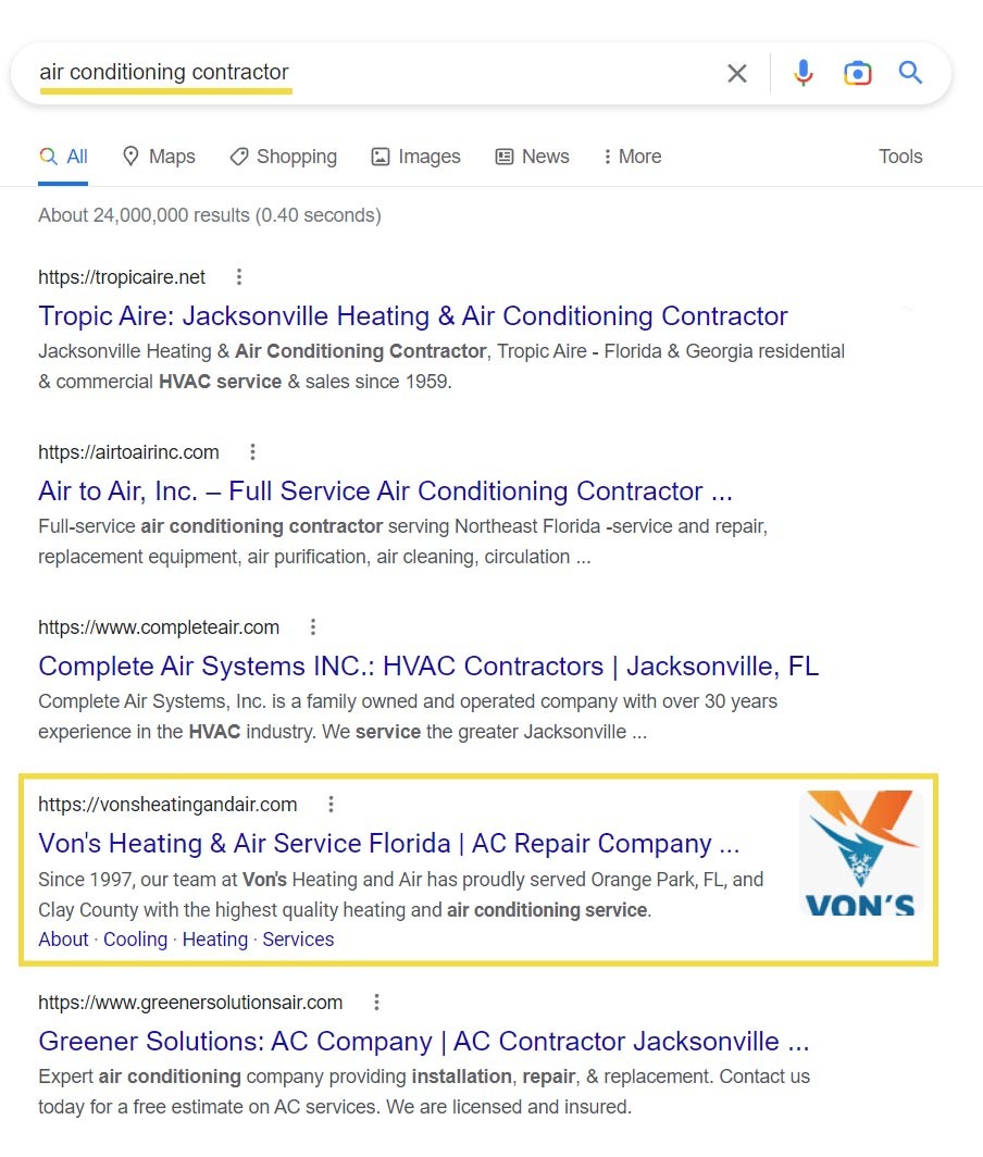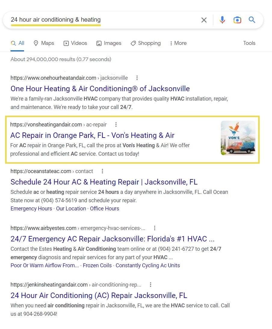 Orange Park, Florida sits on the outskirts of Jacksonville, a major metropolitan area. Not only is there immense competition in the HVAC industry, but the hot Florida climate means there’s a constant need for AC repair, service, and replacements. We wanted to make sure that Von’s Heating and Air showed up for local searches for anything related to heat or air conditioning in the area and outranked other competitors, many of which being major corporations with large marketing budgets.