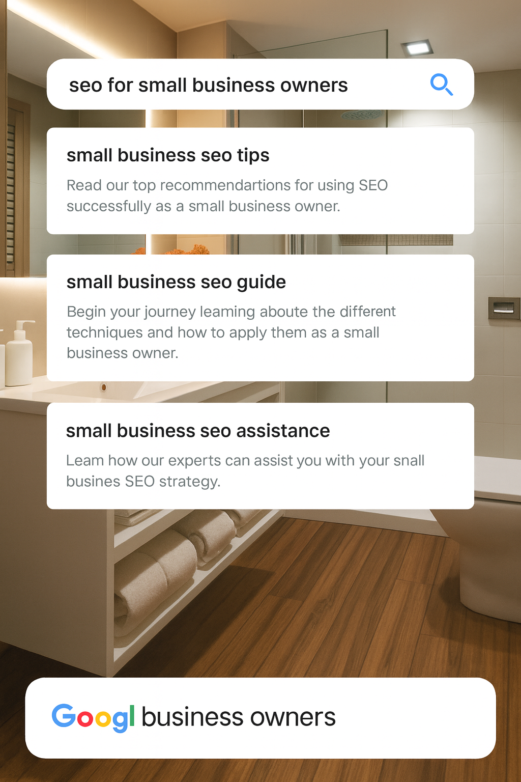 Identify high-impact search terms, like “walk-in shower remodel,” “bathroom renovation near me,” or “ADA bathroom upgrade”, and create pages that match homeowner needs and intent.